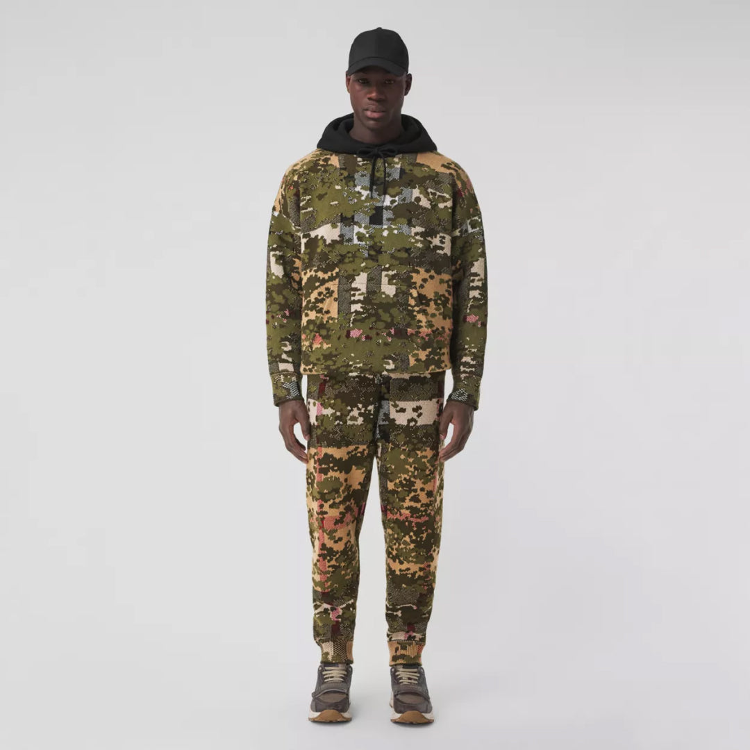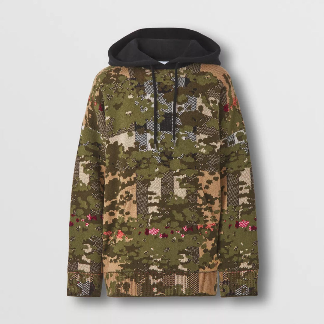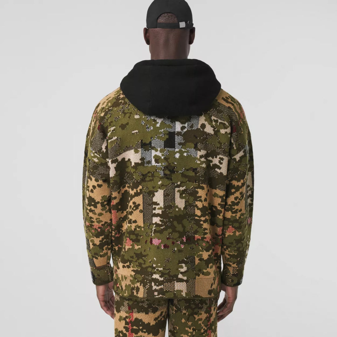 A hoodie elevated in an Italian-woven wool blend, jacquard-woven with a camouflage pattern. The design is highlighted with ribbed trims and a contrasting hood in a solid colour.