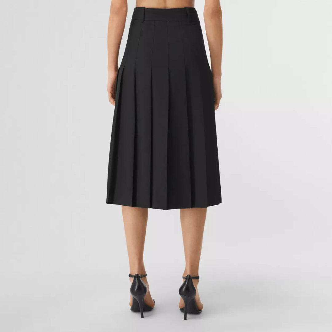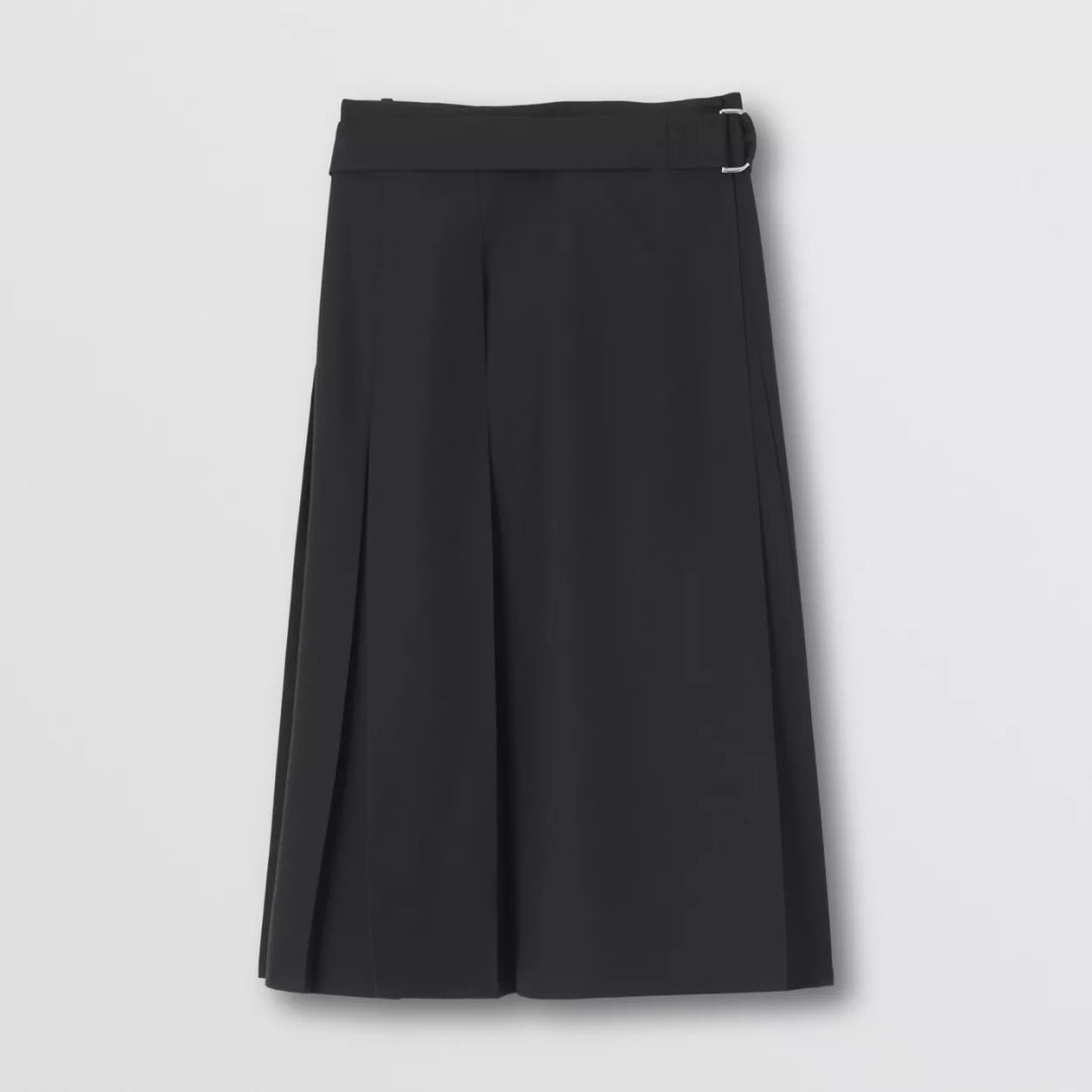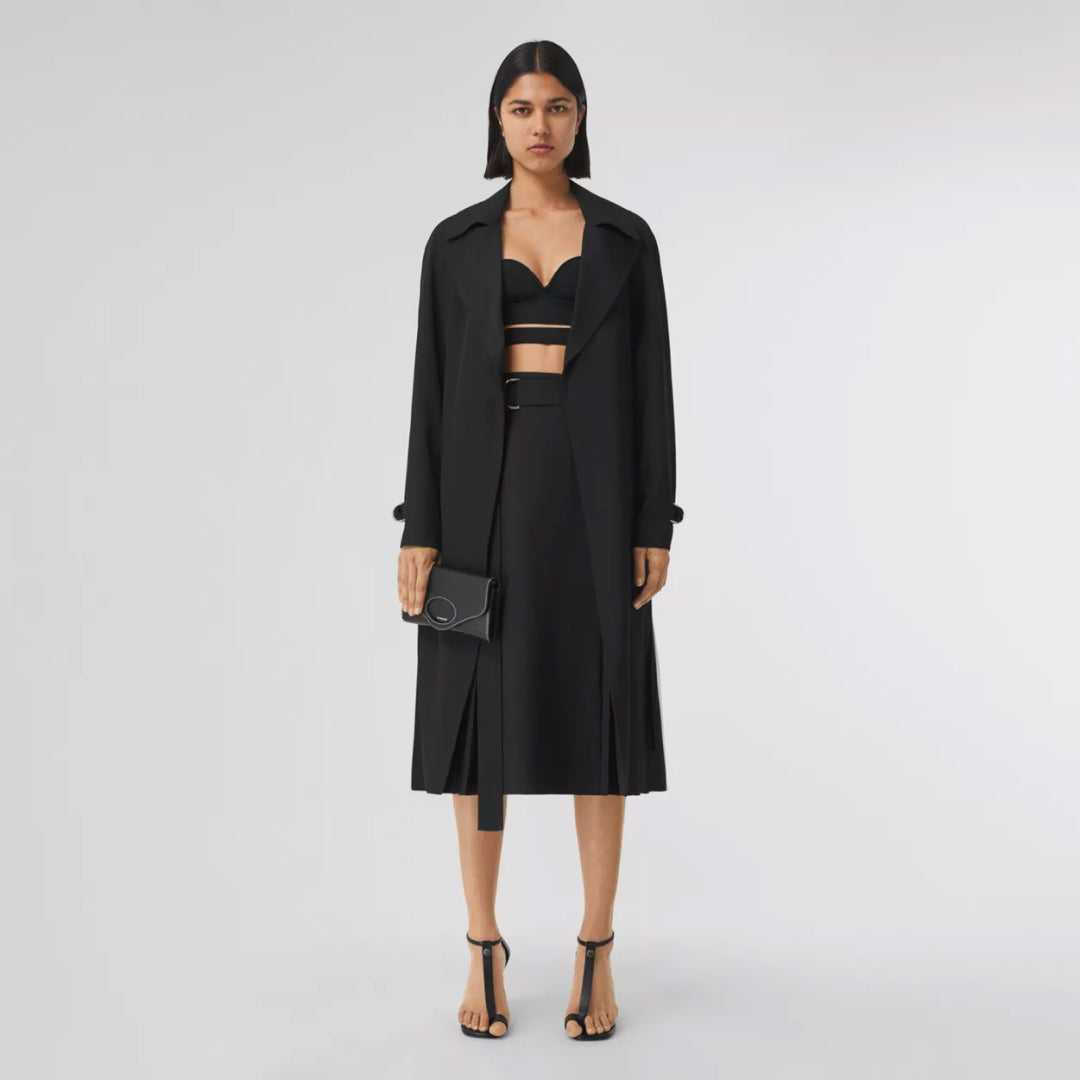 A longline silhouette woven from wool, tailored with sharp pleats. The design is accented with a polished D-ring.
