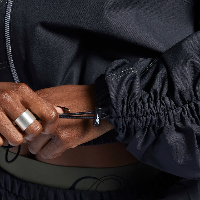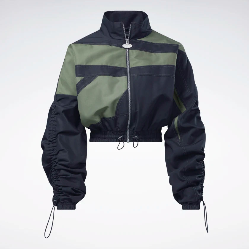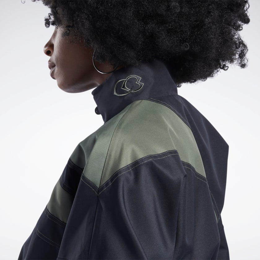Slay your daytime hustle when you wear this women's jacket from Reebok. A comfortably oversize fit and an eye-catching Vector design give you a versatile design. Adjust the ruching on the sleeves to switch it up. For a complete look, pair it with the Cardi B track pants.
