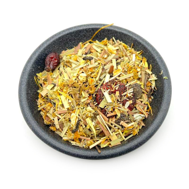 Swiss secret - herbal blend of lemongrass, calendula, tea rose, jasmine buds, peppermint, green tea, as well as chamomile, orange peel and strawberries, cherries, rose hips.