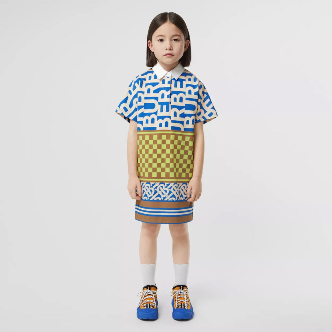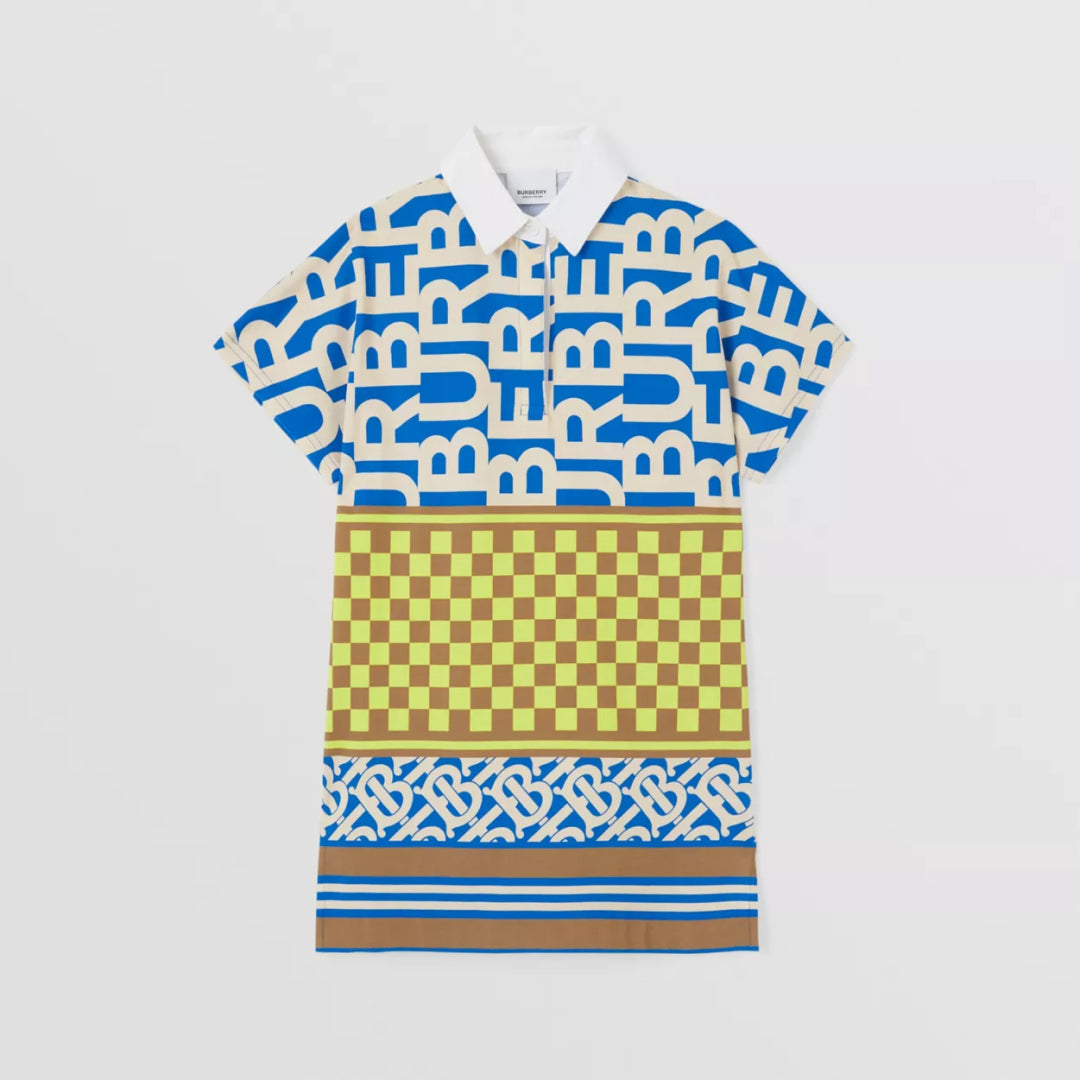 A short-sleeved dress in cotton, patterned with a montage of our house codes. The practical style is accented with a neat point collar.