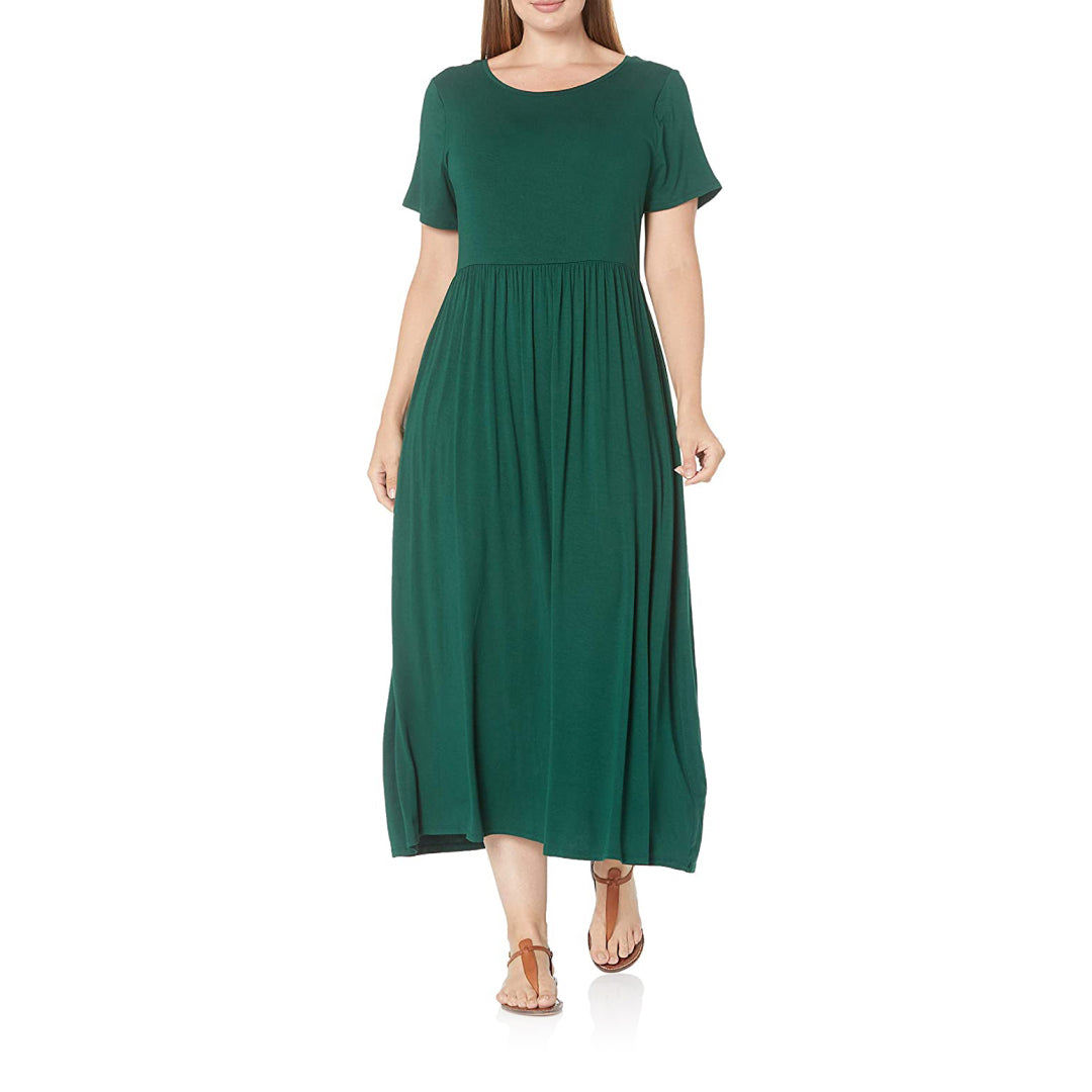 Stylish waisted maxi dress featuring short sleeves, a scooped neckline and patterns perfect for a casual day out;