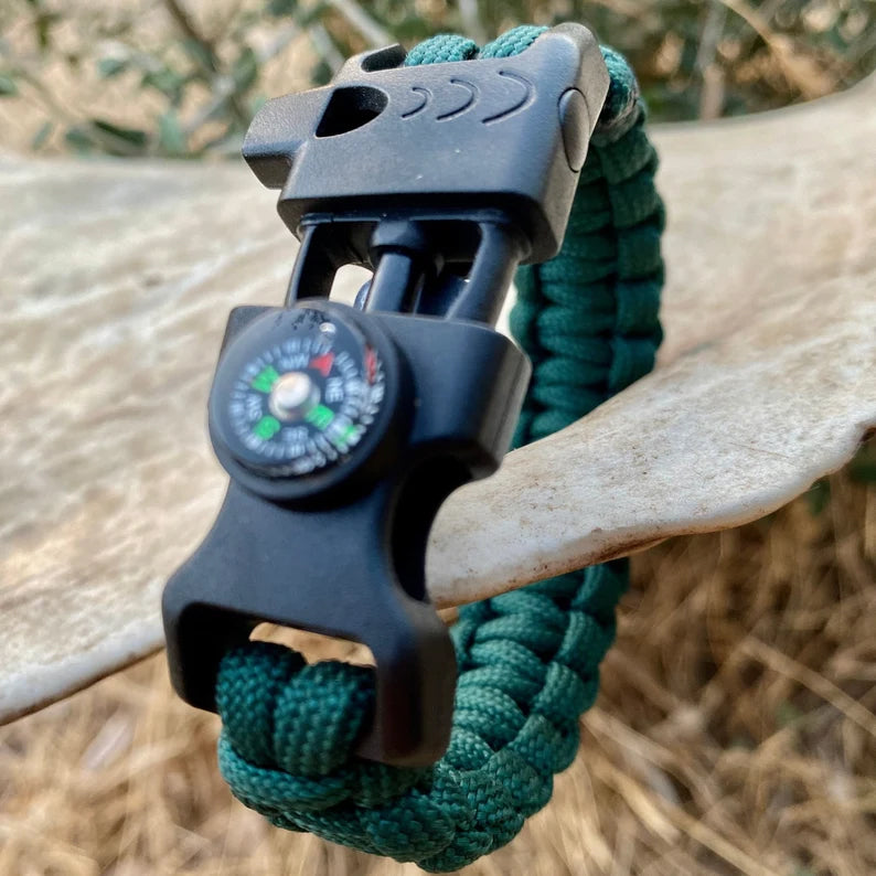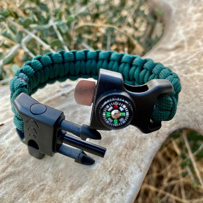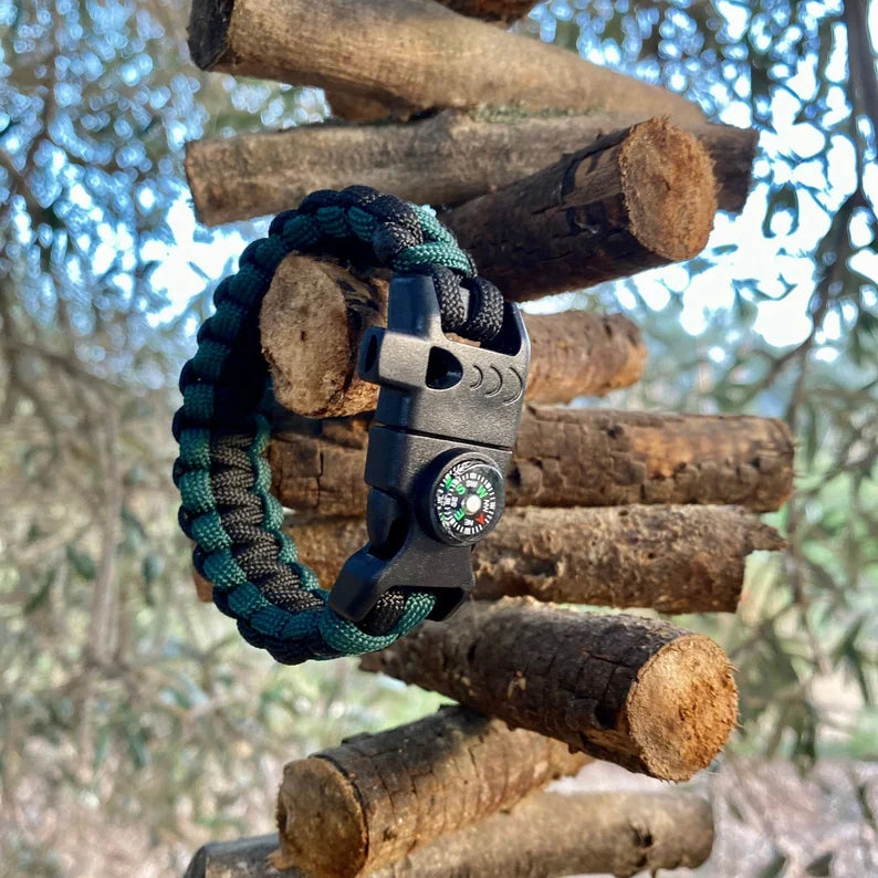The bracelet includes a COMPASS, a WHISTLE to call for help and a FLINT STONE (magnesium) with a Blade to scratch in order to make a fire.
