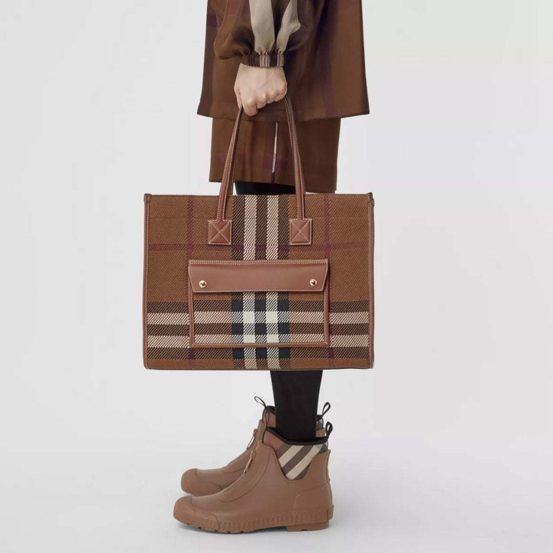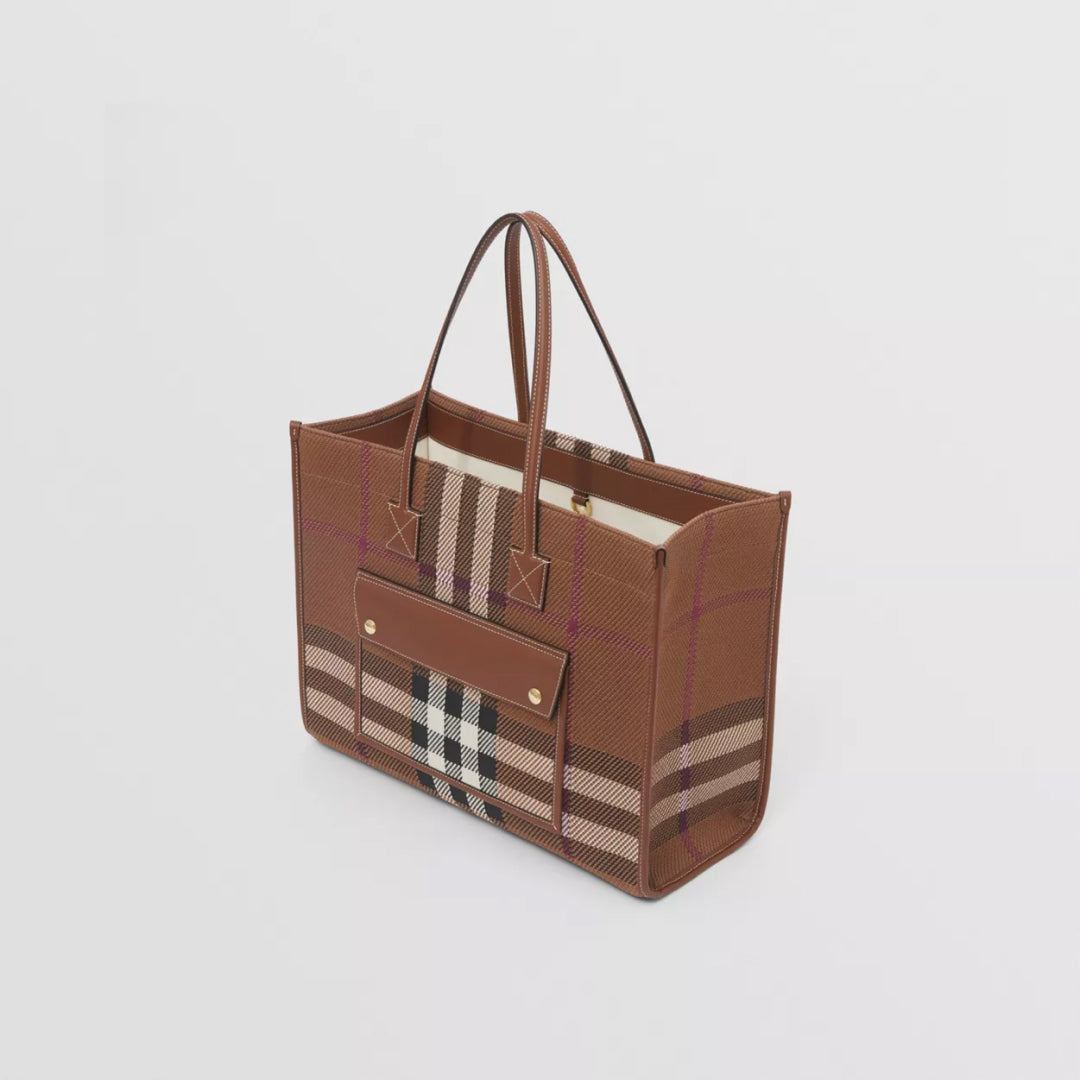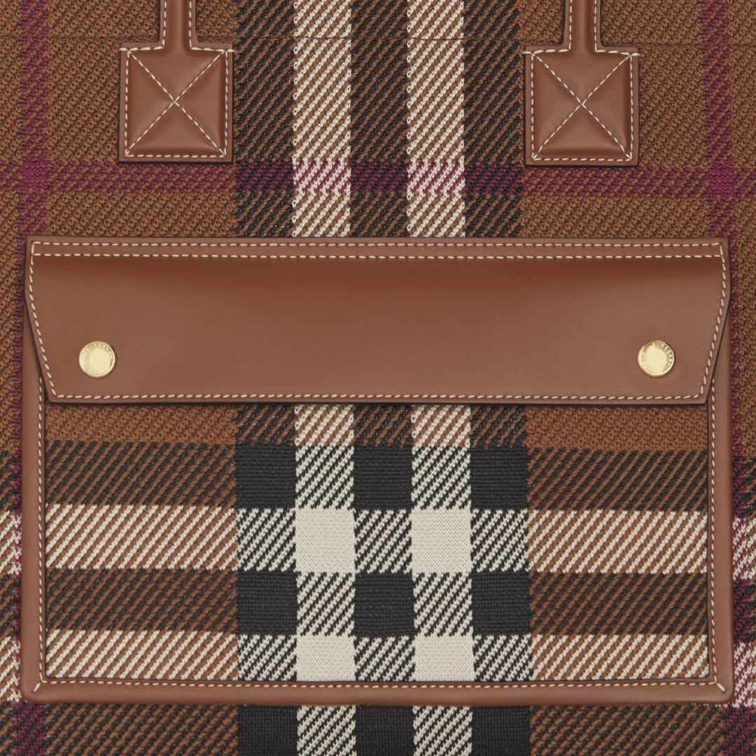 An Italian-made knitted check tote, accented with smooth leather trims. Carry in hand or on the shoulder.