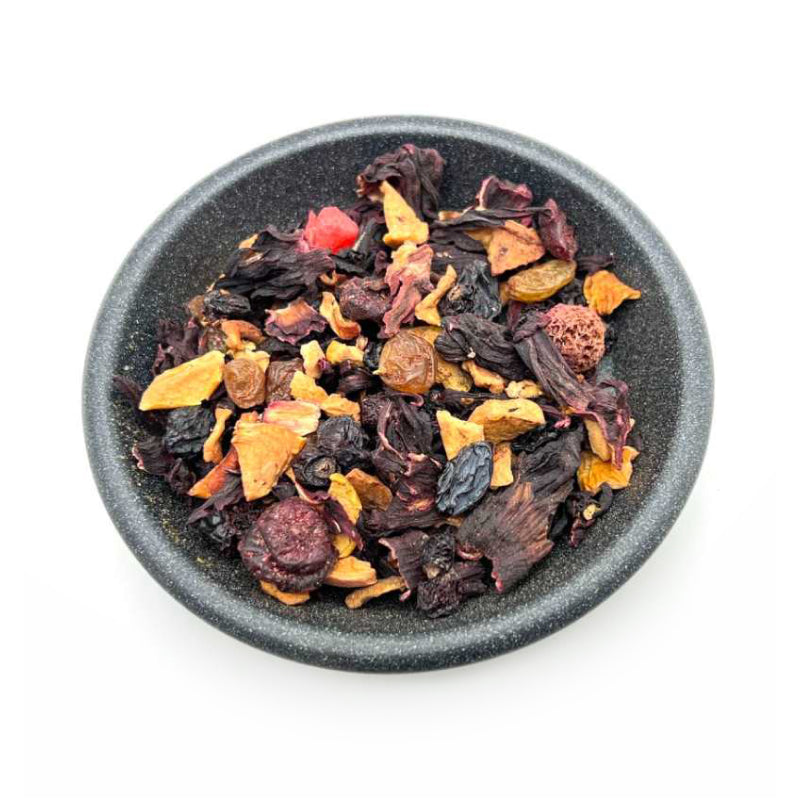 Fruit tea with fruits of dried grapes, apples, cranberries, cherries, raspberries, strawberries, currants and hibiscus will brighten up the working week and fill your day with vigor