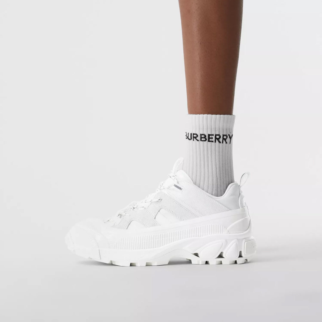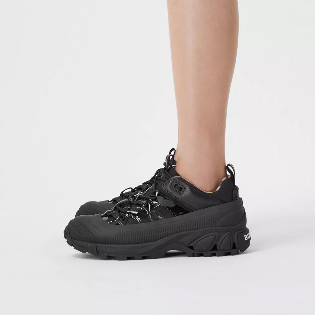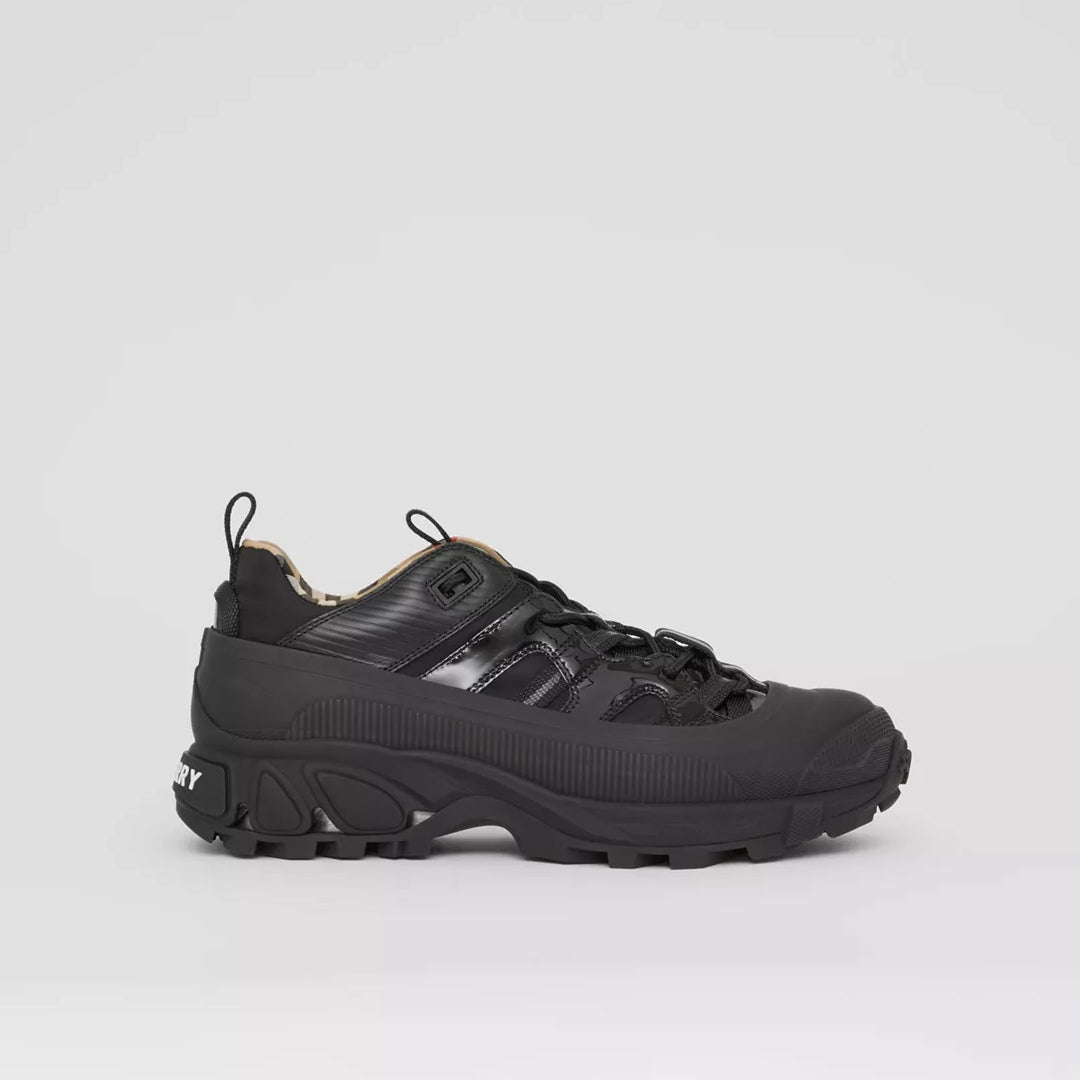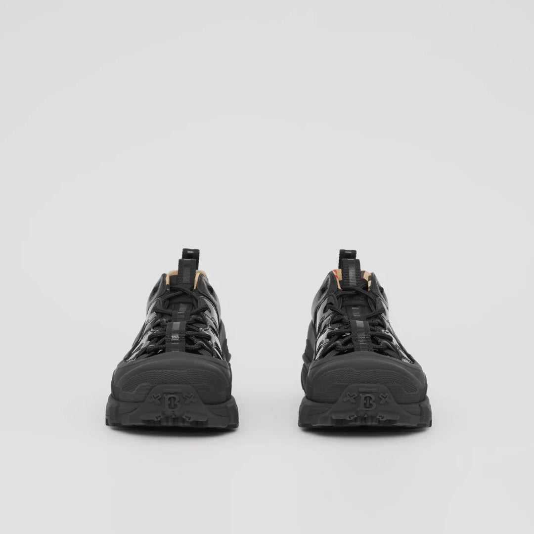Introducing our new runway sneaker crafted in smooth leather. The style is capped with a matte overshoe inspired by rain boots and a cross-detailed tread referencing our iconic check.