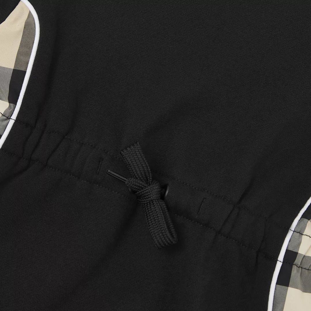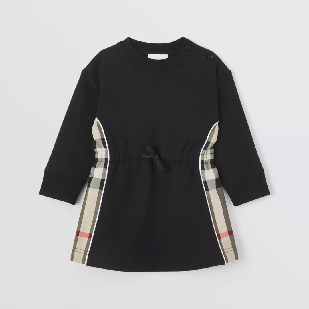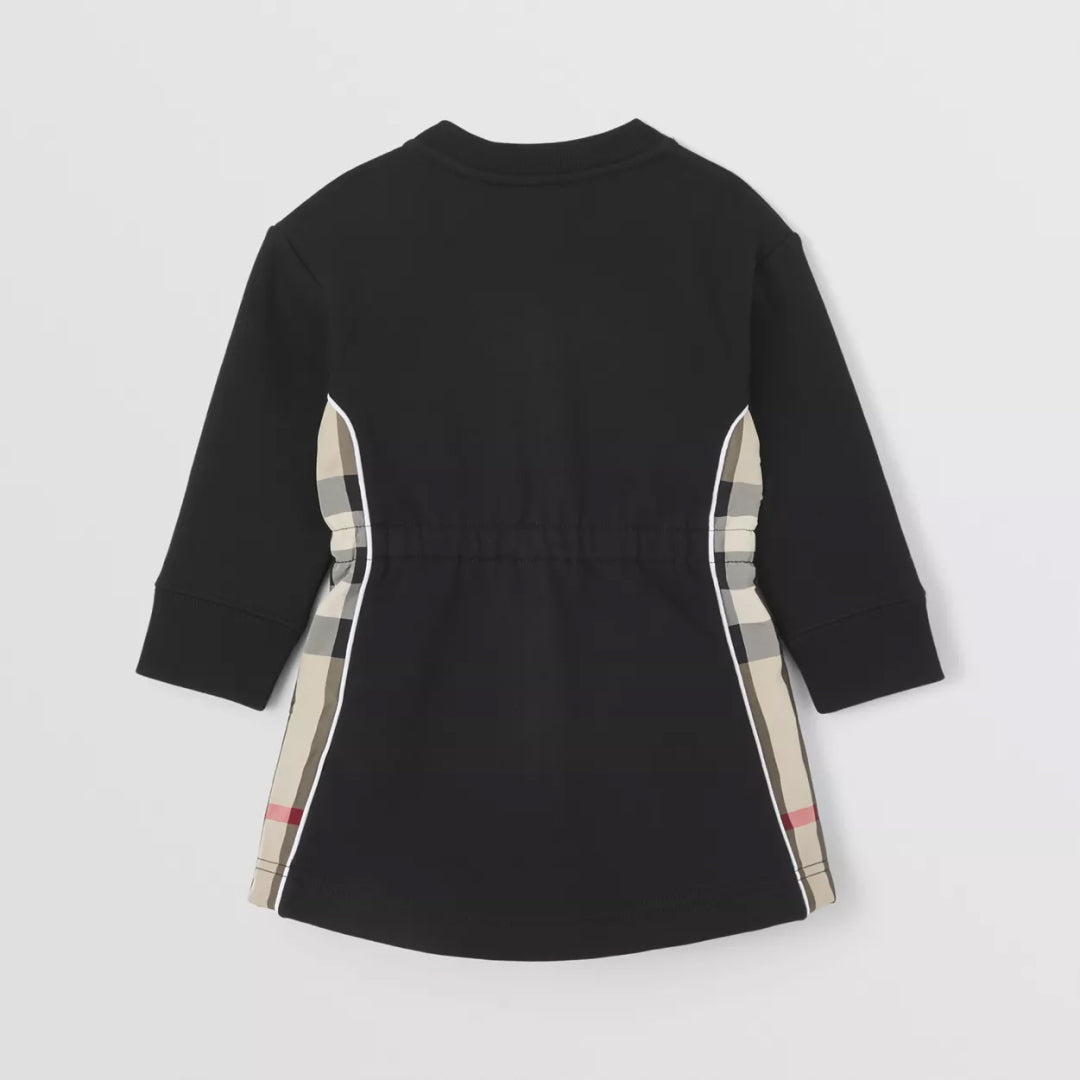 A long-sleeved dress in loop-back cotton, featuring a drawcord waist and contrasting check panels. Buttons at the shoulder allow for easy dressing.