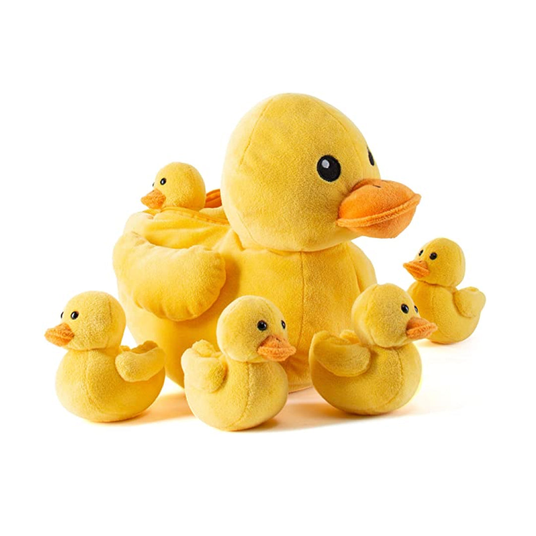 Unique 10 inch handmade plush mama duck with 5 little ducklings. Close the ducklings inside the large duck for easy storage and transport. Includes: Five high-quality washable ducklings with a large 10-inch zippered duck mom. This uniquely designed giant duck is a suitable home for splendid and soft babies. Stuffed Ducks are the best Christmas gift for children of all ages.