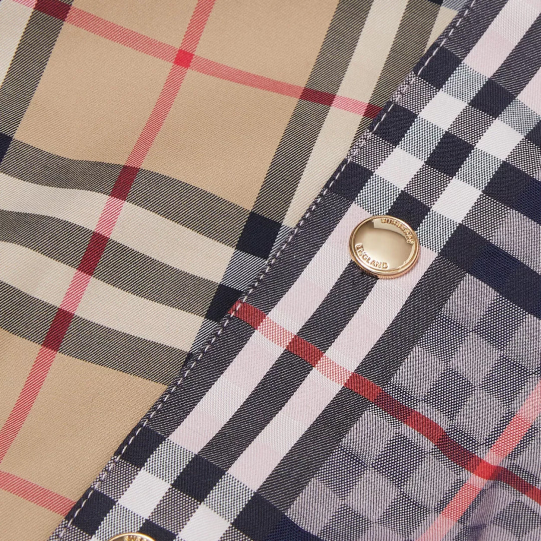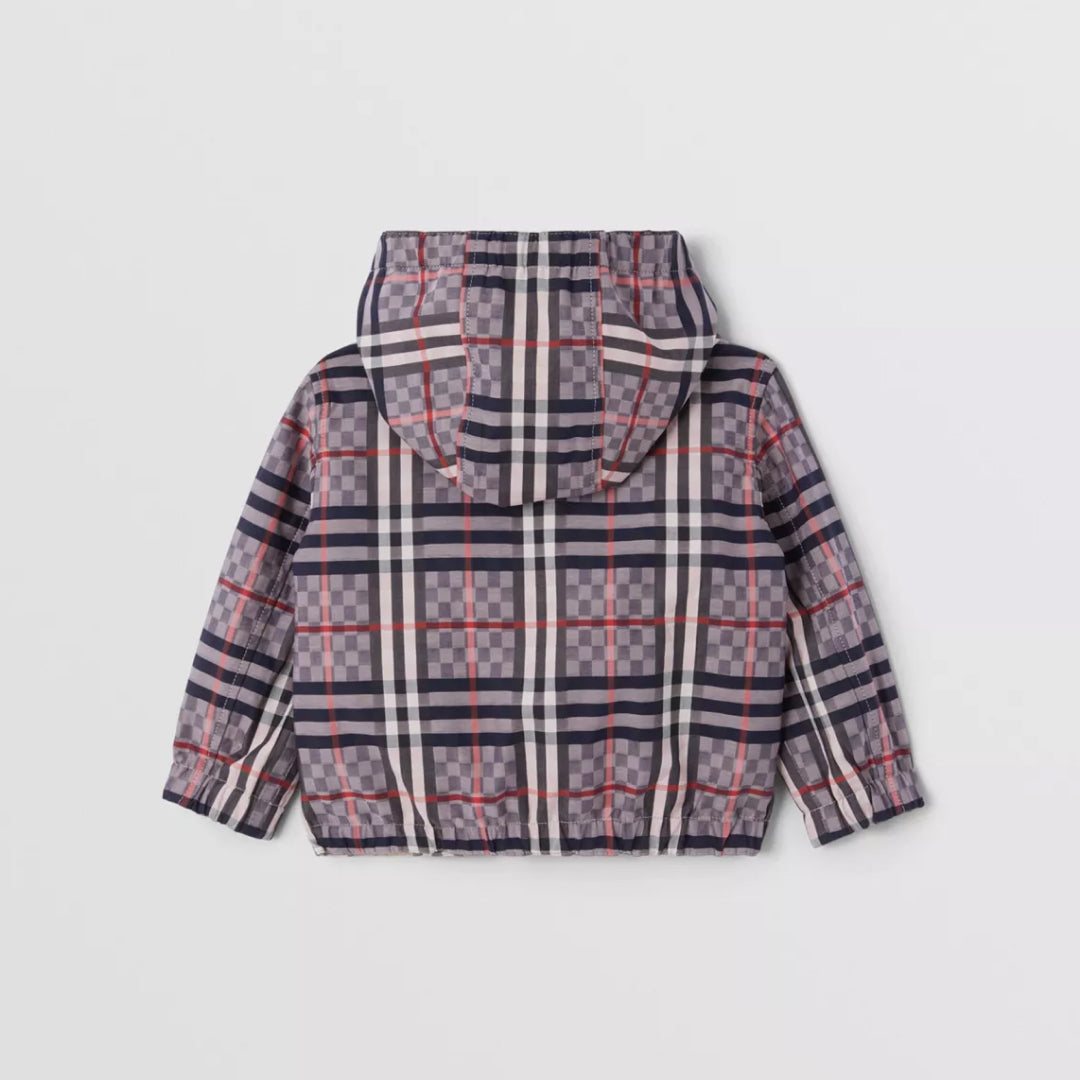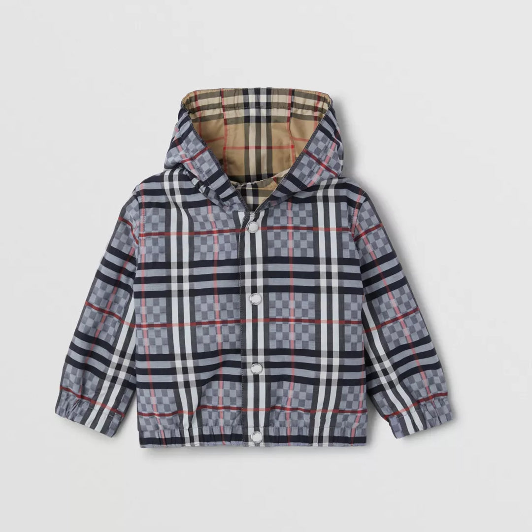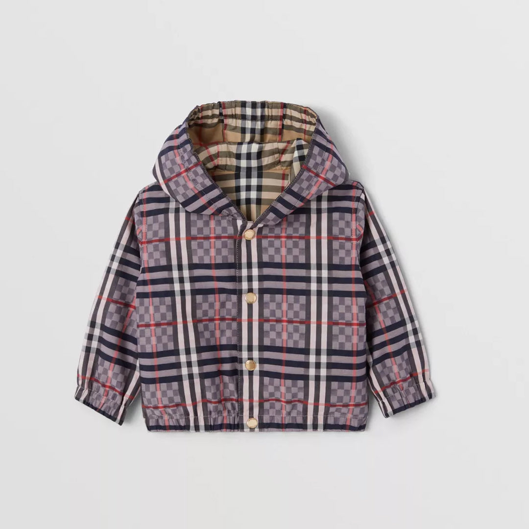 A hooded jacket in stretch cotton, reversing from a jacquard-woven chequerboard pattern to our archival Vintage check. The design features logo-engraved press studs and elasticated trims.