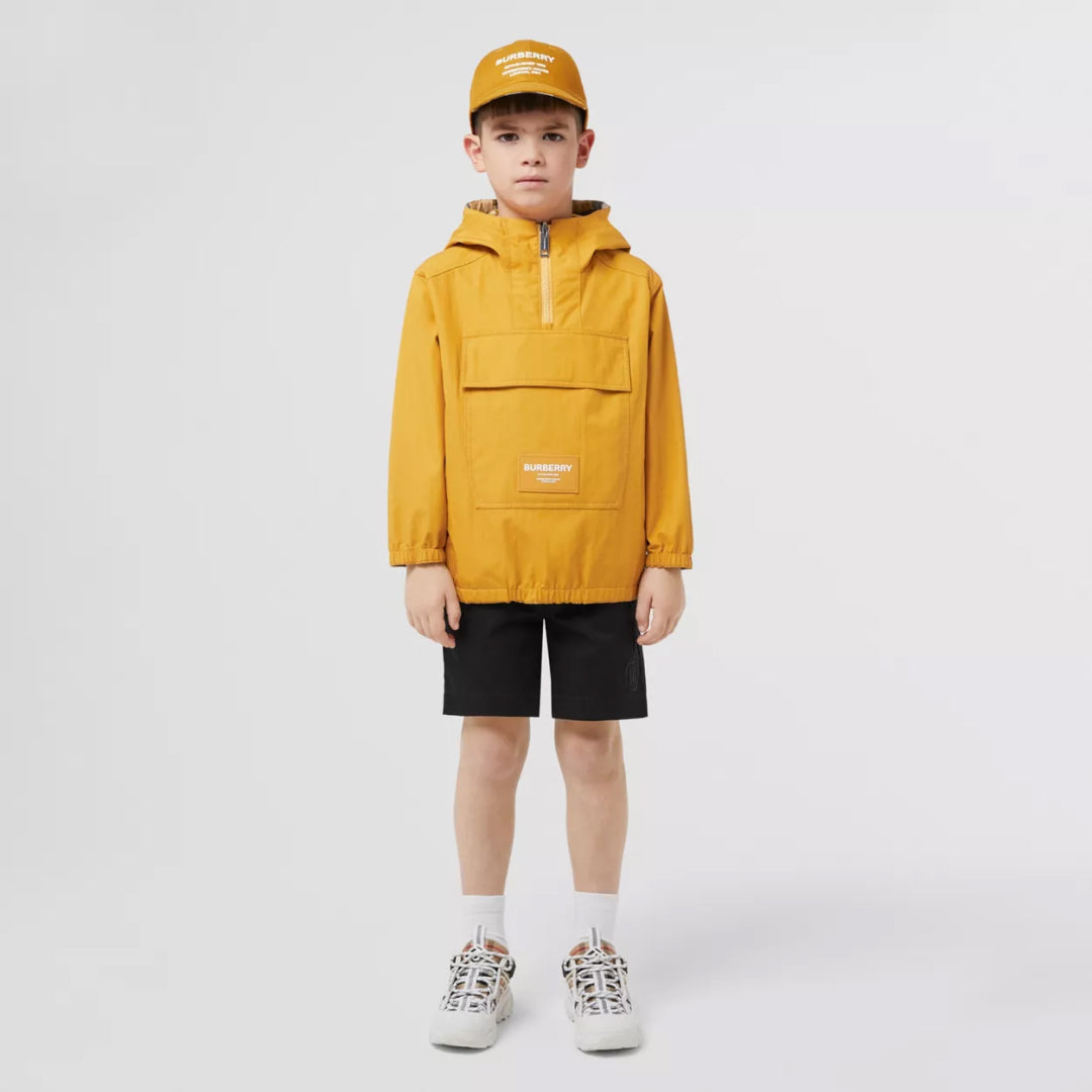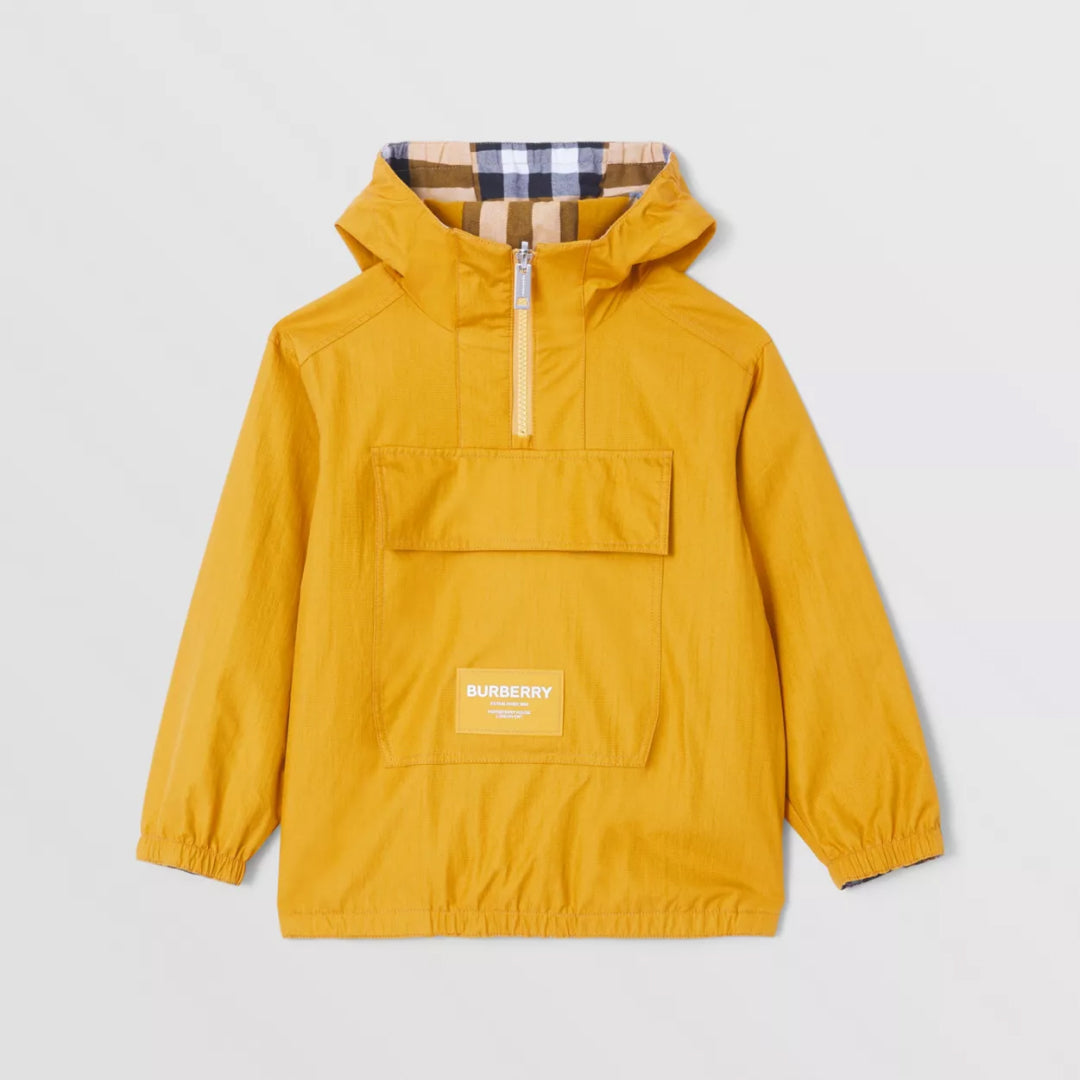 A versatile hooded nylon jacket, appliquéd with our Horseferry motif at the oversized chest pocket. The lightweight design reverses to a contrasting check cotton flannel.